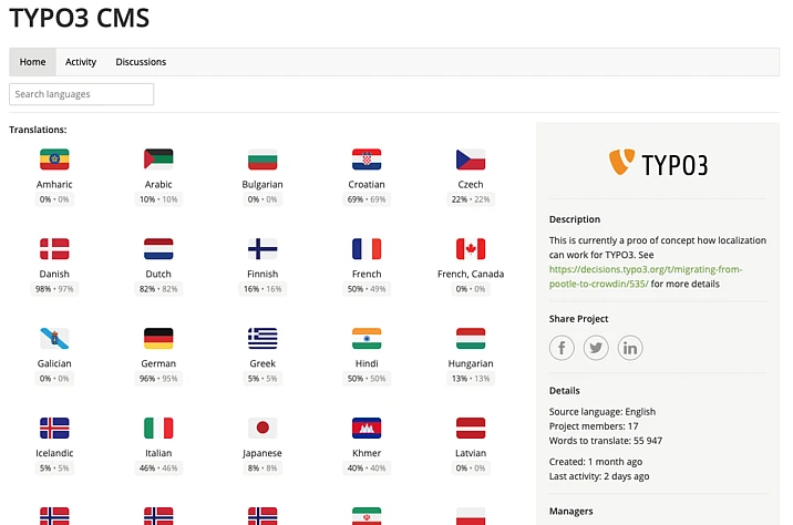 Since 2011, we used Pootle software on the TYPO3 Translation Server to provide translators with an interface to localize labels of TYPO3 core and extensions. This self-hosted solution required a lot of work on the part of the Server team and in particular Xavier Perseguers. Moving to a SaaS solution will allow us to concentrate more on the actual work of translation rather than the infrastructure. Crowdin offers a free plan for open source projects and uses AWS for their computing infrastructure.