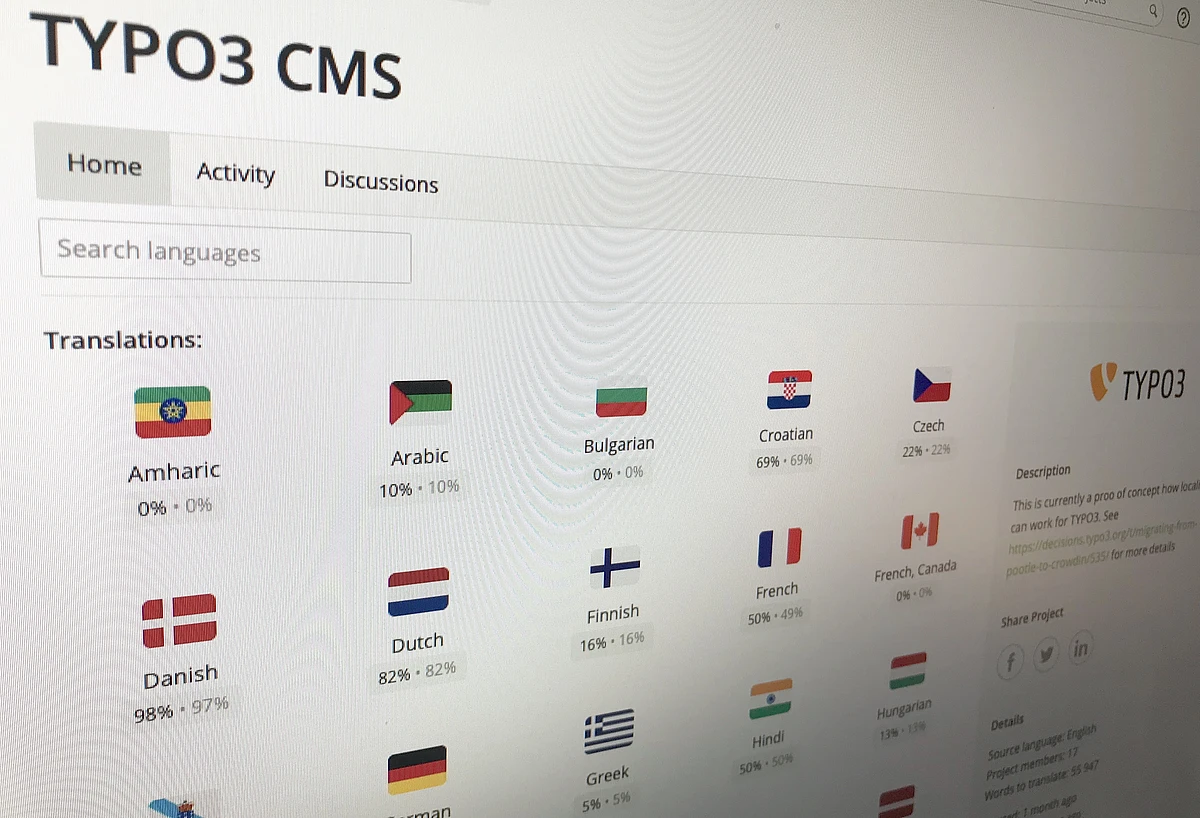 The multilingual backend has always been a great benefit of TYPO3. Whether you’re French, German, or English-speaking, having the editing and administrative user interface in a language you understand means you can work faster and more confidently. After a long history with Pootle, TYPO3 is moving on to Crowdin, to take translation to the next level.