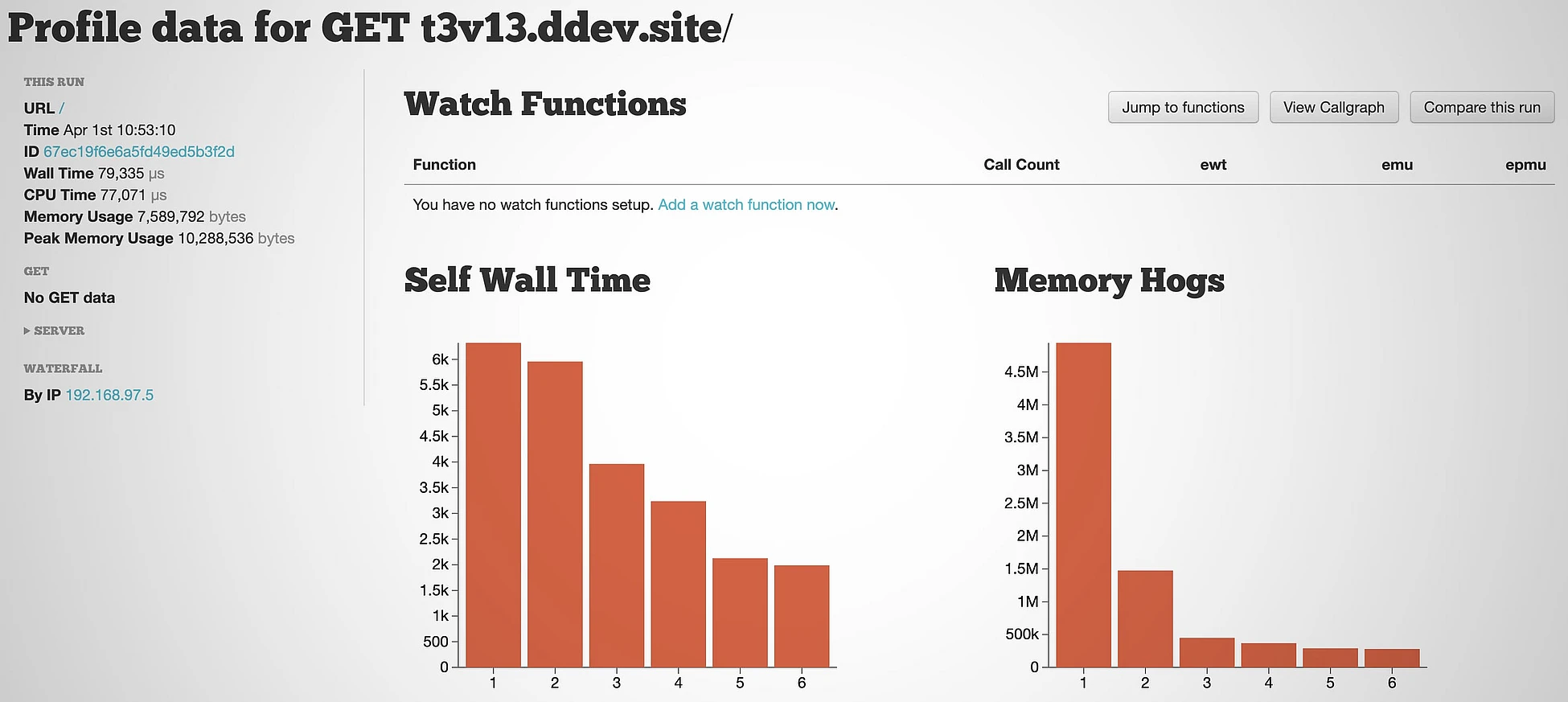 The integrated XHGui feature means that you can use DDEV XHGui on and start profiling (collecting data about performance) immediately, without any other steps. After you turn it on, every web request is captured, and then you can use ddev xhgui launch to open the XHGui UI.