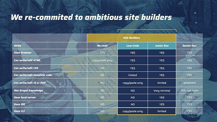 Drupal markets itself for enterprise too, but its roots lie elsewhere, in activism, politics, education, and science, for example. The Drupal community has also long held the concept of the ambitious site builder — the happy amateur who loves creating great works of website-building art by assembling ready-built pieces, and with little coding involved. Since version 8, the persona of the ambitious site builder had almost disappeared from the project's rearview mirror.