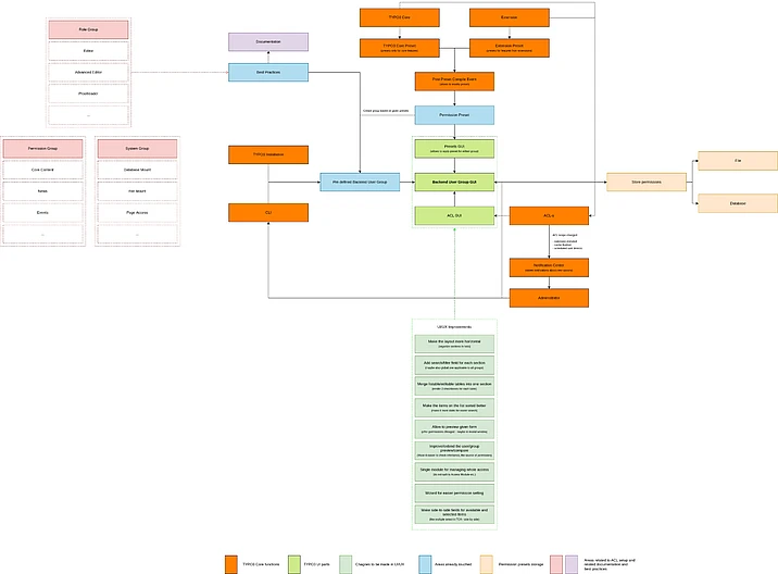 The diagram features blue rectangles indicating areas already addressed during our work on ACL Improvements in Q1. This work included creating static permissions presets for default backend user groups, updating the installer, introducing a new command for creating these groups, and compiling best practices for ACL management into the official TYPO3 documentation.