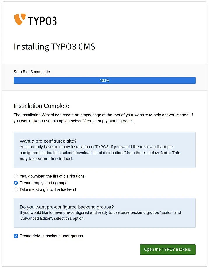 Configuring permissions for backend users can often be a lengthy task, particularly for individuals keen on testing TYPO3 and discovering its features. To streamline this aspect, we've improved the installation's last stage by introducing an option to establish default backend groups. This option allows for the easy assignment of users to these groups later on. Simply ticking a checkbox marked Create default backend user groups will automatically set up two predefined groups: Editor and Advanced Editor, each with preset permissions tailored to their respective roles.