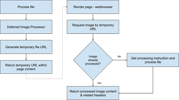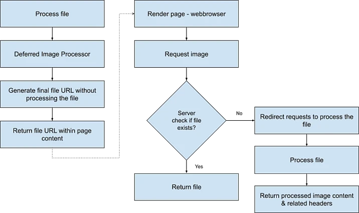 This method ensures that even when image processing is deferred, the final URL for a processed image is generated, addressing caching and SEO concerns. It involves a specialized processor storing instructions in the database without immediately processing images, allowing the final URL to be retrieved and included in page content. When an image is requested, the server checks if the file exists; if not, it redirects the request to be handled by middleware, requiring server configuration.