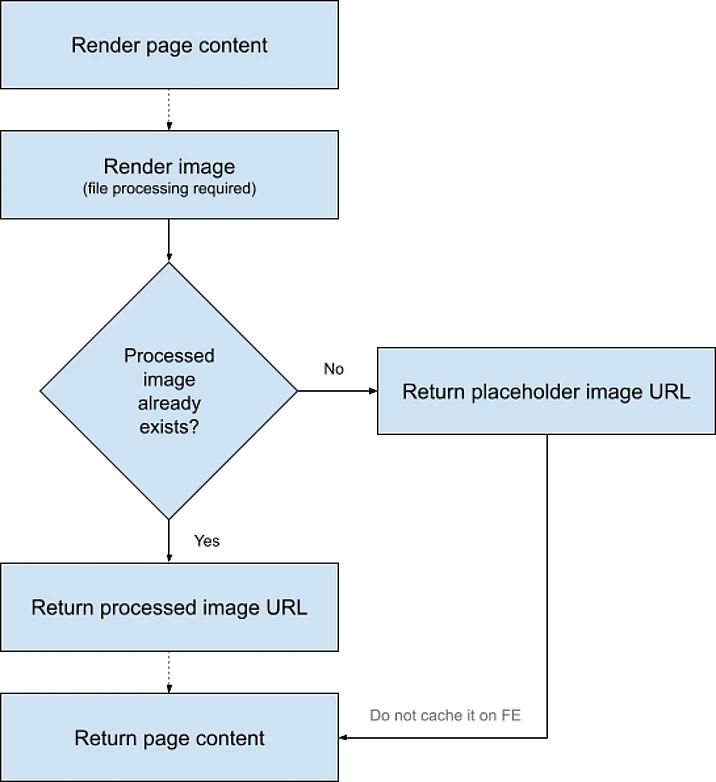 This strategy uses a dedicated processor to generate temporary URLs for unprocessed images, allowing pages to load without delay. When a temporary image URL gets called, early processing by dedicated middleware is key for efficiency, and security measures must ensure only valid images are processed to avoid misuse and mitigate DDoS risks. Temporary URLs within page content should not be cached until final URLs are used (to avoid SEO risk if search engines encounter these first). An alternative is making pages with pending images uncached, but this might reduce performance on busy sites.