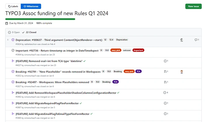 All implemented rules can be found on the Q1 2024 Milestone of the TYPO3 Rector repo.
