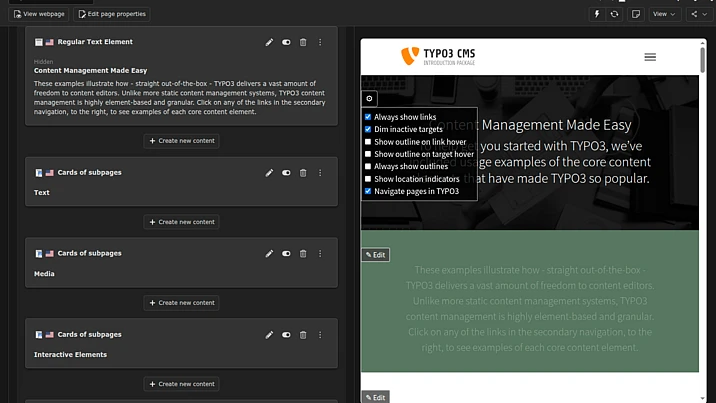 One of the most exciting experimental features is the ability to navigate TYPO3 directly from the preview, without using the Page Tree. It’s enabled by default but you can disable it via Settings.