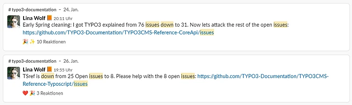 Lina Wolf has committed herself to the task for this year. During the last week of each month she investigates all those "difficult to solve" issues and pull requests that would otherwise pile up. This had brought down the number of open tickets significantly. For example, in January 2021, our largest manual TYPO3 Explained had 76 open issues, many of them laying stale for years. As of April 2021, we are down to 13.