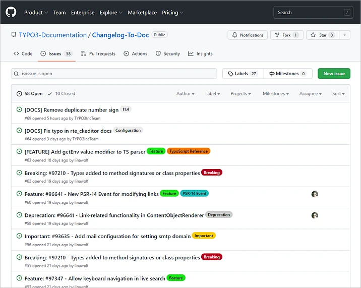 Every change made in the TYPO3 Core has a corresponding Forge ticket and at least one Changelog entry. To get a better overview of each ticket involved in a release, and the corresponding documentation required, we are experimenting with a new GitHub Project: Changelog-To-Doc. Every Changelog entry automatically creates a GitHub issue in the project.