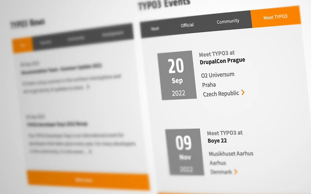 There is a new event listing at typo3.org, where all of the titles start with “Meet TYPO3 at …”. These are external events where a person representing TYPO3 will be present.
