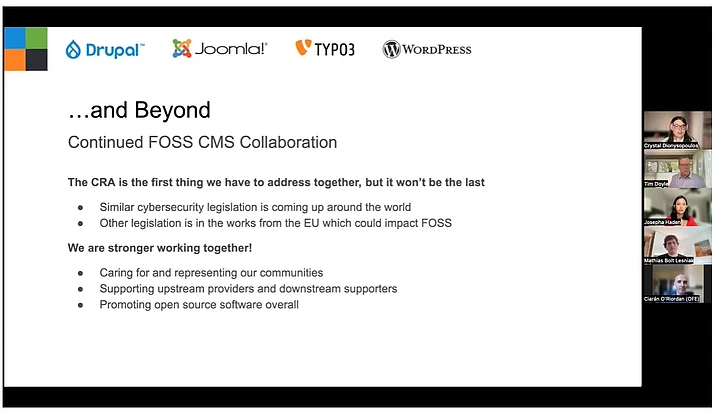 Representatives from Drupal, Joomla, TYPO3, Wordpress, and OpenForum Europe held a joint community meeting to talk about the European Union’s proposed CRA legislation, and why cooperation between our projects is important. Contribute your thoughts by answering eight questions!