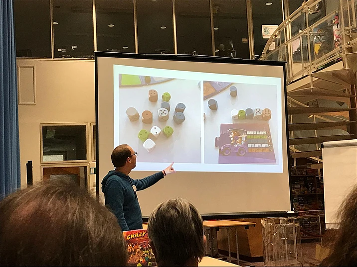 To kick off, Daniel Greiner from Ravensburger introduced us to the process of game development using the board game Crazy Race as an example. He talked about the not-always-fun work as a tester when games still have incomplete or broken game mechanics, and need a lot of refining to really motivate future players.