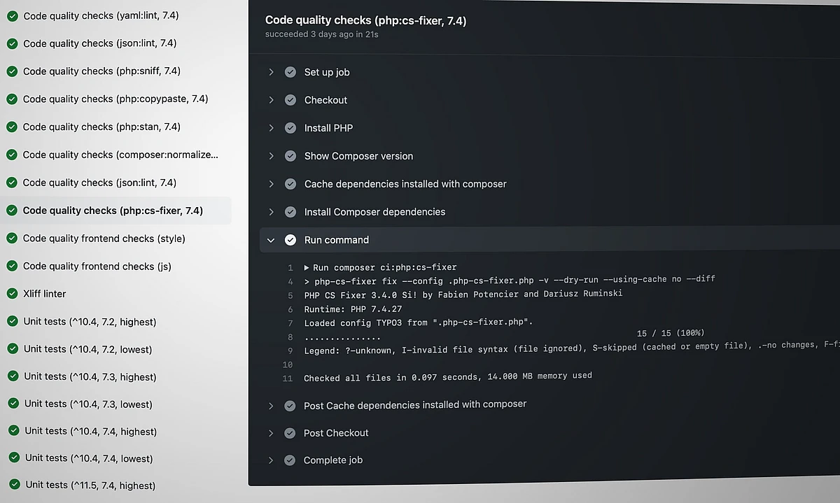 Oliver Klee gave a presentation titled Automating the Code Quality of Your Extensions at the TYPO3 Online Days 2021, during which he demonstrated our results. The full video is available on YouTube at.
