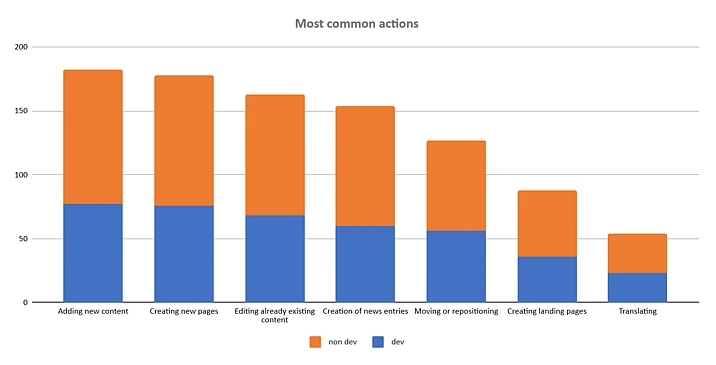 Although TYPO3 is a CMS designed for multilingual projects, surprisingly, translation is not part of the most common actions. The most common actions users undertake are the creation of pages, contents and news. We have also found that creating landing pages is not so rare nowadays, it seems to be an more and more frequent action. This need will have to be taken into account.