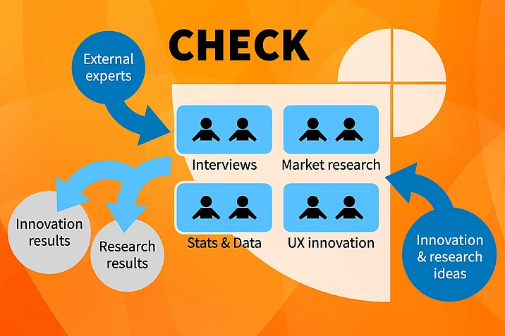 Check is all about research and innovation. This is where new ideas are created by the community. Each idea should be founded in research and tested with the target audience. Both internal and external information should be used, and external experts may be brought in to contribute outside perspectives.