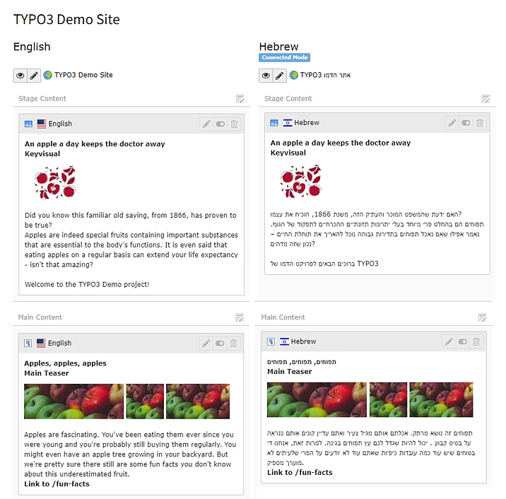 Translating content in the demo project into languages with different directions means that users can get a feel for the editing experience in the backend. For editors working with translations, the content elements for each language are easily identified. Users can log in as editors, and directly interact with content in English, German and now Hebrew.