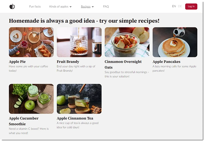 The major challenge was to choose a common, non-biased topic that would allow us to create original content. We decided to go with a website about everyone’s favourite fruit: apples!.
