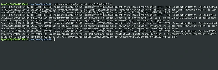 Once enabled, you find the log file in the “log/” directory of your TYPO3 instance (the exact path may vary depending on your setup and configuration). TYPO3 only writes log entries when a user accesses the system that uses a deprecated component.