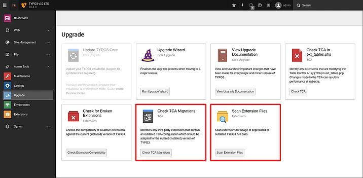 The following two features are particularly useful to run before you execute a TYPO3 upgrade: “Check TCA Migrations” and “Scan Extension Files”. You can find both backend functions under Admin Tools ➜ Upgrade.