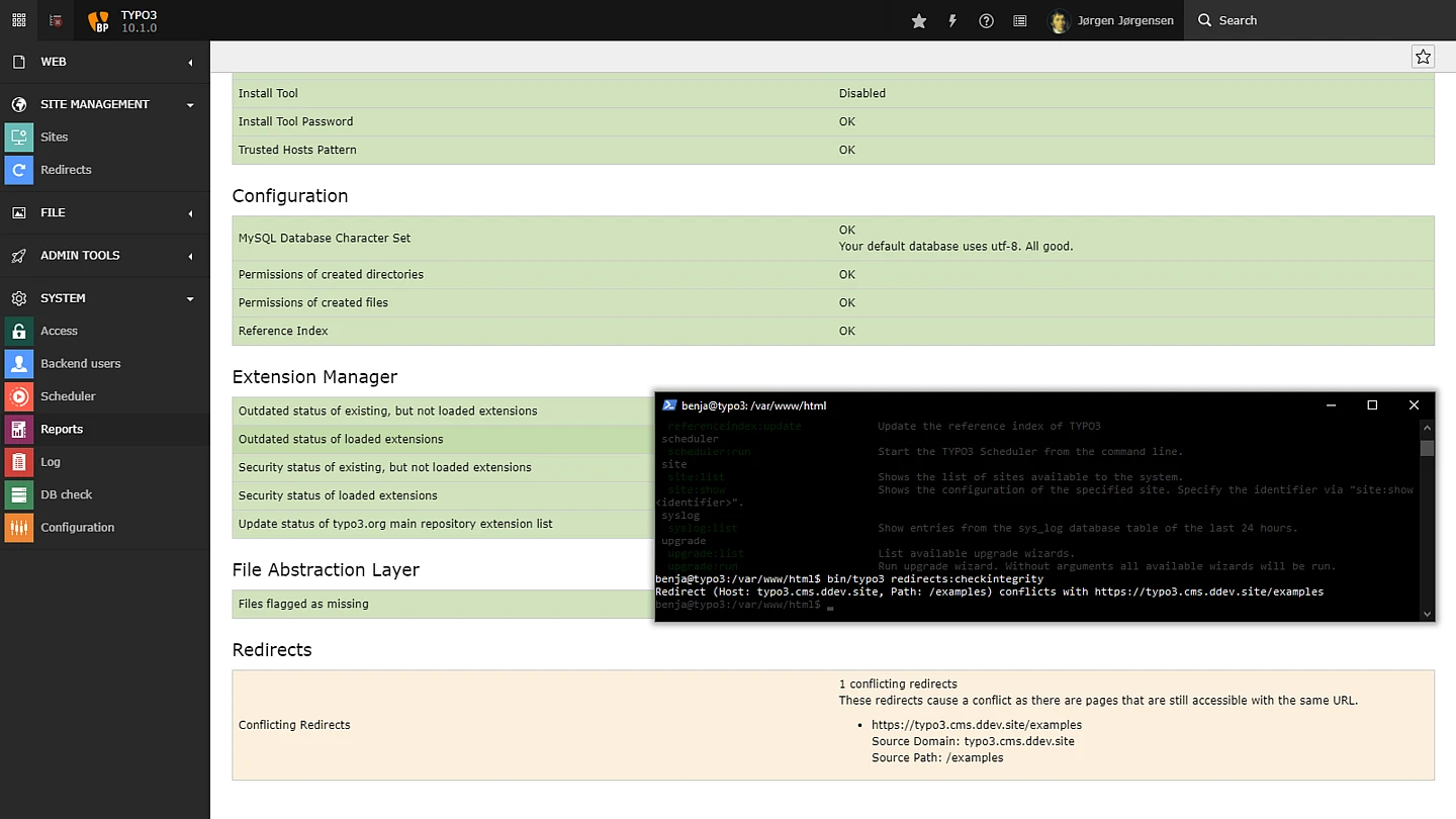 The Redirects backend module was introduced with TYPO3 v9 and lets site administrators add and configure redirects. The source path can be an arbitrary name or it can be represented as a regular expression. This provides great functionality but what if a redirect has the same name as a page URL? Configuration mistakes like this happen and TYPO3 now offers a simple solution to detect conflicting redirects: a CLI command that shows a list of clashes (if any exist). This command can also be configured as a scheduler task, and the results are shown in the backend under “SYSTEM ➜ Reports”.