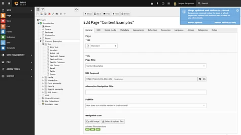Supporting backend users in their daily work and making TYPO3 as robust and user-friendly as possible has always been very high on our list. Sometimes it is necessary to change the URL path of a page (the so-called “slug”) and backend users can easily do that in TYPO3 if they have the appropriate access permissions. However, such an action usually results in a “page not found” error if a visitor to the site tries to access a page using the old slug. TYPO3 version 10.1 now features an intelligent solution: It automatically updates the relevant slugs for all sub-pages and can create redirects from the old to the new URL. Backend users are informed about these actions and can easily roll back the changes with a click of a button.