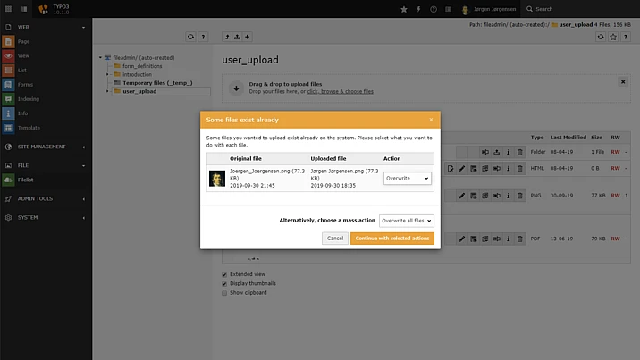 Integrators will embrace this new feature and backend users will love it for sure: the default action when backend users upload files is now configurable! In previous TYPO3 versions, the default is “Skip this file” if backend users try to upload a file that already exists. This is, of course, the safest option, but TYPO3 v10.1 allows you to re-configure it, making the file upload functionality more flexible and user-friendly. Available options are “replace”, “rename”, and “cancel”.
