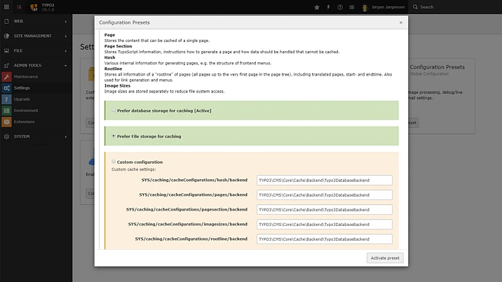 TYPO3’s caching framework uses the database as the storage for caching by default. However, various tests show that this is under certain circumstances, not the perfect and most performant configuration. Depending on the environment and hosting setup, a cache stored in the file system is faster. Integrators and administrators can now configure the storage type for caches.