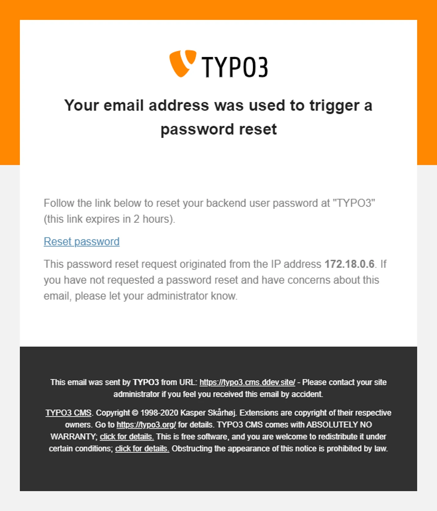 In TYPO3 v10 LTS, administrators can trigger a password reset for users in the TYPO3 backend. Backend users are now also able to request a password-reset email in a secure way.