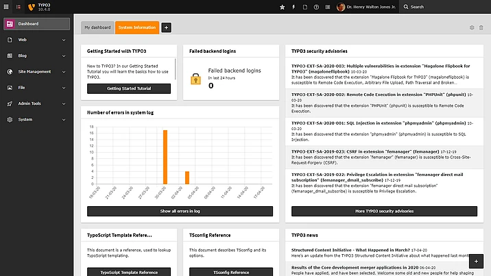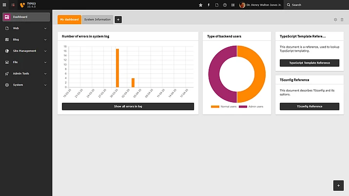 Dashboards feature great flexibility and expandability. We made it super-easy for developers to create their own widgets and publish them as TYPO3 extensions. TYPO3 v10 LTS comes with a selection of widgets already.