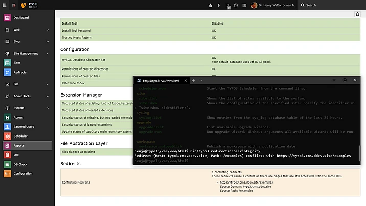 Configuration mistakes like this can happen and TYPO3 now offers a simple solution to detect conflicting redirects: a CLI command that shows a list of clashes (if any exist). This command can also be configured as a scheduler task and the results are shown in the “Reports” backend module.