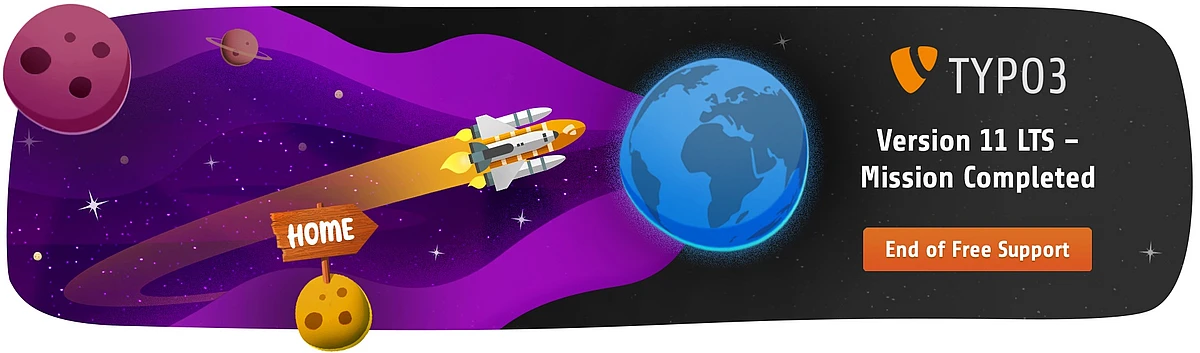 The free support for TYPO3 v11 LTS, including maintenance and security updates, ends on 31 October 2024. From this date, the TYPO3 community will no longer publish updates for TYPO3 v11 LTS.