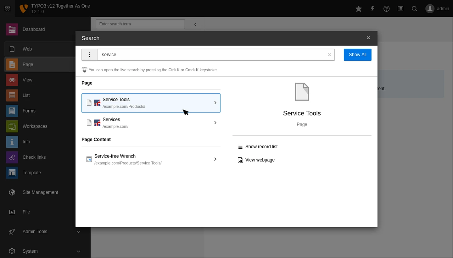 In the previous sprint release, we changed the dropdown box to a modal. Backend users can open the search by clicking on the magnifying glass in the header. Following the TYPO3 UX Team’s suggestion, you can also use the keyboard shortcut Ctrl/Cmd+K to open the search. This follows the common practice in several other applications and websites such as Discord, Slack, etc.
