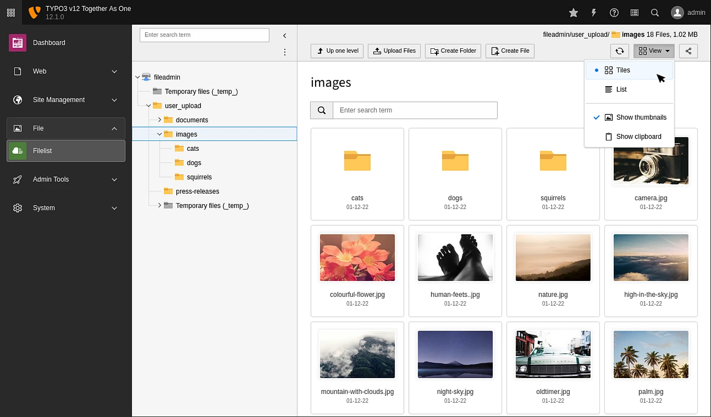However, many backend users are more interested in a larger thumbnail and fewer details of the asset. This, for example, applies to editors who maintain the content of a TYPO3 site. The following screenshot shows the new tiles view that is now available in TYPO3 version 12.1 and set as the default: