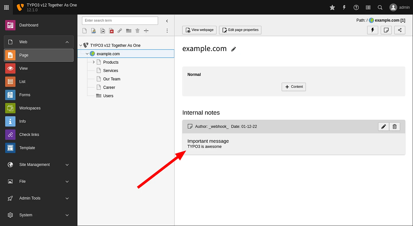 Let’s use a simple example. A remote system should add a note to a specific page that will be visible to all users who access this page in the backend. With Reactions, you don’t need to write a single line of PHP code to achieve this.