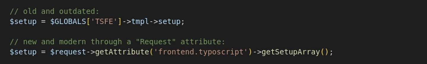 We introduced a new API in TYPO3 version 12.1 that lets developers load the TypoScript of a page in a cleaner, more elegant way. You have possibly used TypoScriptFrontendController->tmpl or $GLOBALS['TSFE']->tmpl in the past. The new API streamlines access to TypoScript and offers a set of methods to retrieve the data through a “Request” attribute. These methods are getSettingsTree(), getFlatSettings(), getSetupTree(), and getSetupArray().
