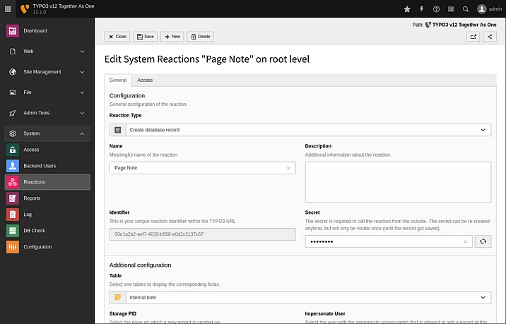 Open the Admin Tools ➜ Reactions in the TYPO3 backend and click the button Create new reaction. Select Create database record from the dropdown box as the reaction type. Enter a name and create a random string as the “secret”. Now, select the table Internal note and the ID of the page that should contain the note. You could select a backend user that TYPO3 should use when it creates the record. For now, select the dummy user “_cli_”. Enter a subject and the placeholder “${message}” in the message field. Finish the configuration by saving your new reaction record.