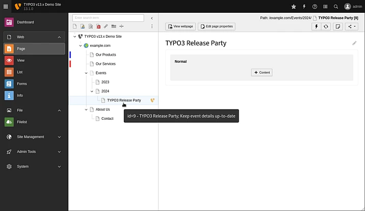 Our catchphrase for the TYPO3 v13 release series is “Minimizing repetitive tasks and simplifying day-to-day work of administrators and editors”. TYPO3 v13.1 already demonstrates how building websites with TYPO3 will become easier, faster, and more straightforward in the future.