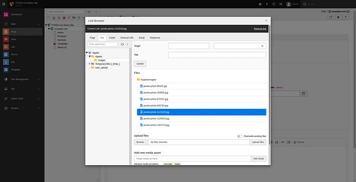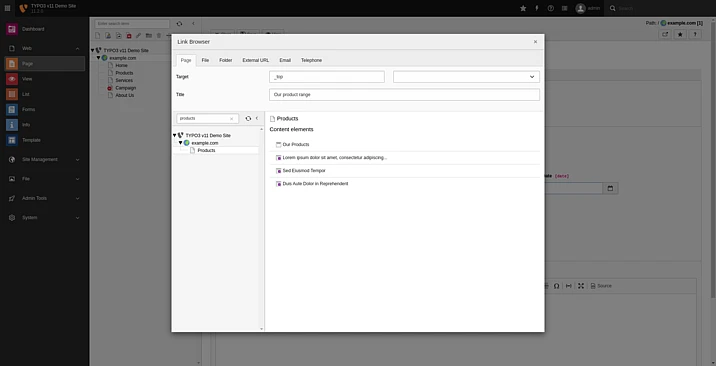 Both components, the page tree and the file/folder list, also appear in the “Record Selector”. This is the modal window that lets users select a page, a file, a folder, an external URL or an email address, etc. The Record Selector now features the same state-of-the-art components and architecture for the page tree and the file/folder list.