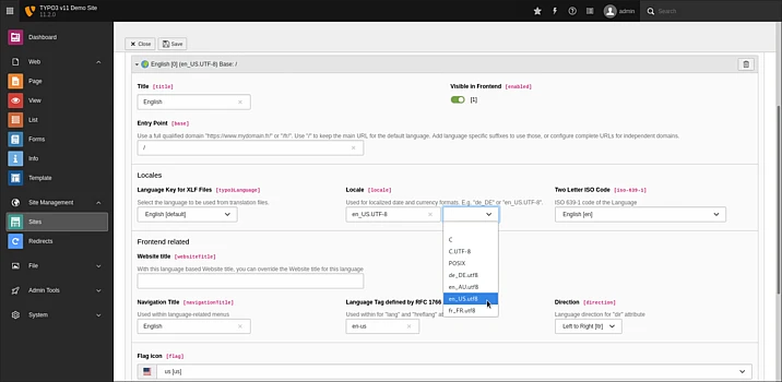 In older versions of the CMS, when setting up a new site for their instance, TYPO3 integrators had to enter the locale identifier by hand. To make it faster to set up a site and its languages, TYPO3 v11.2 now detects which locales are available on the system and lists them in a dropdown box.