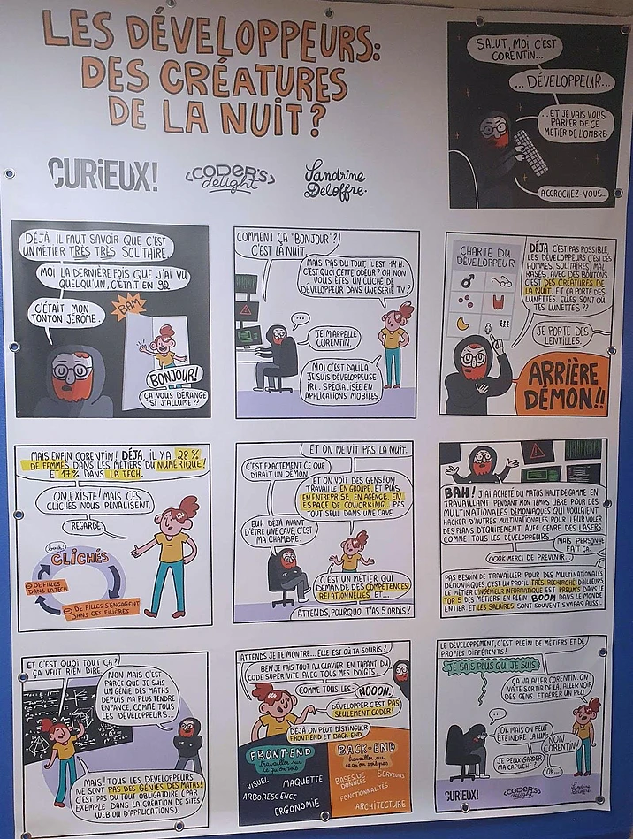 The Cobalt coworking space in the center of Poitiers was the ideal choice for this event. It was in a pleasant, bright patio where participants were able to exchange freely with superb grignottes. I couldn't resist snapping a photo of the poster on the patio's central wall, which puts across the important message of diversity in tech in a very amusing way: