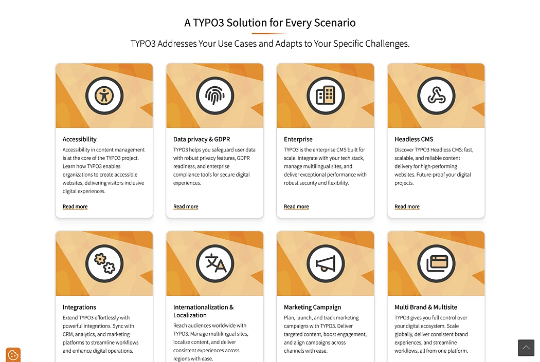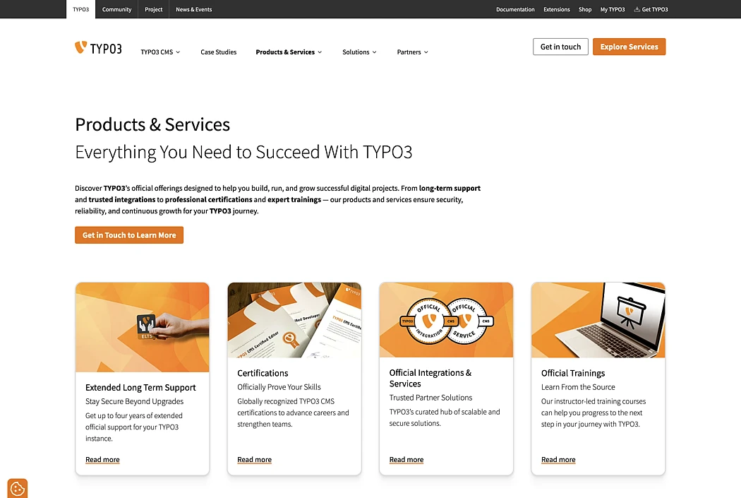 typo3.com is the product home, and the strongest selling points align with sought after features. Communications Manager Panos Semitekolos has created a content strategy to better define key industries and use cases. The content is backed by real data and a substantial selection of case studies from our partner agencies, curated by communications manager Kendall Litton.