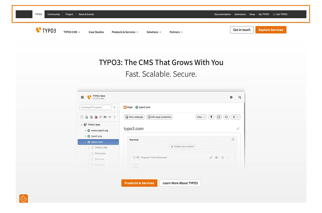 - Community (typo3.community) shows how to participate, contribute, and get involved.