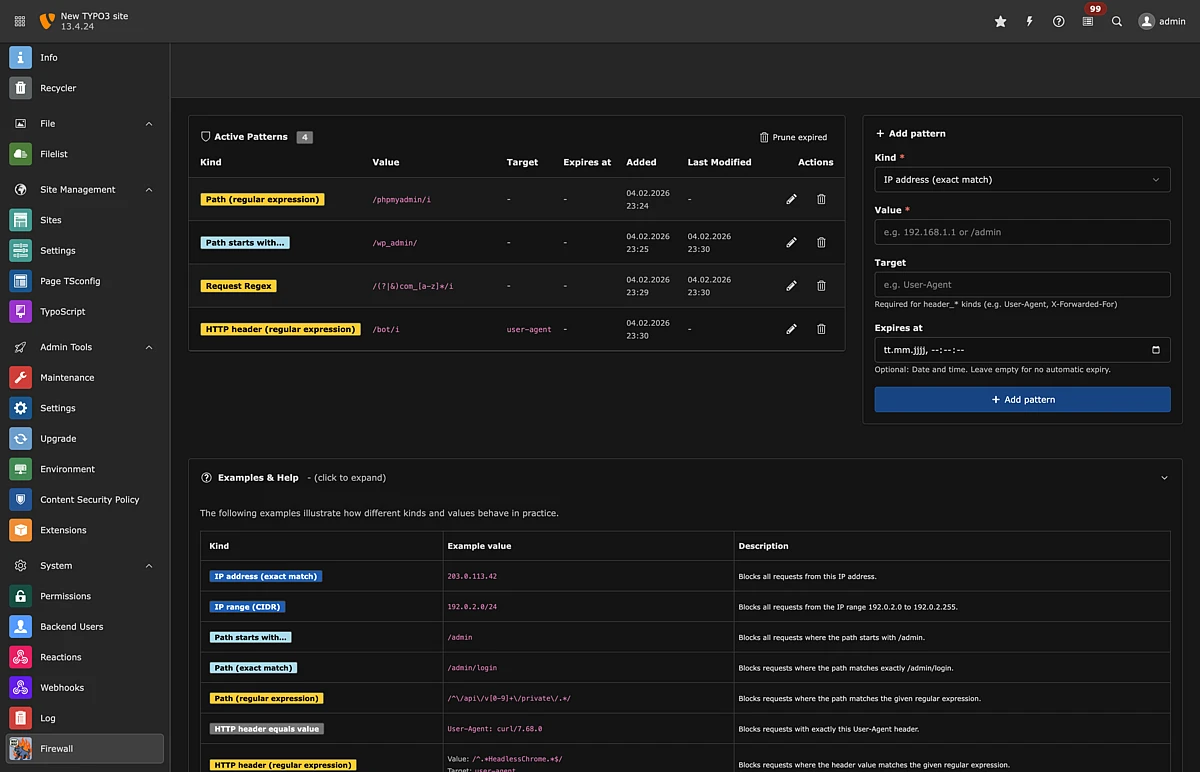 The goal of this project was to provide a rule-based firewall inside TYPO3 itself. The firewall runs early in the request lifecycle, is fully configurable in PHP, and works without infrastructure-level access.