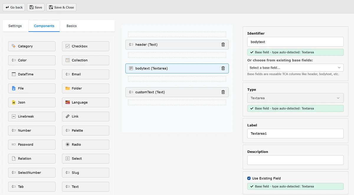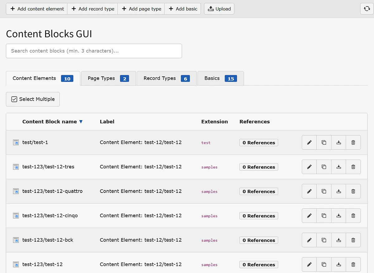The current implementation already covers the core functionality developers need. You can create, copy, delete, and edit Content Elements, Record Types, Basics, and PageTypes through the interface. The GUI also supports batch operations like downloading and uploading multiple Content Blocks at once, which simplifies migration between projects.