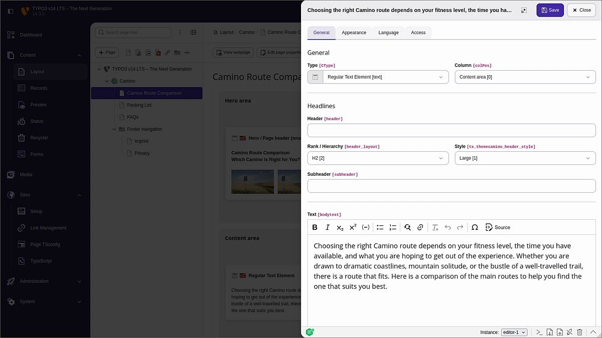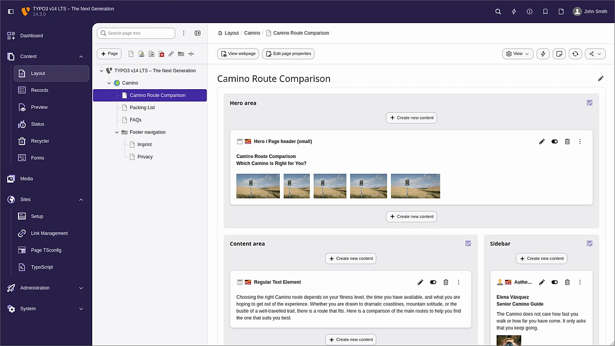 From a modernized backend and intuitive navigation, to easier page creation and context aware editing, along with improvements to page translation workflows, TYPO3 v14 delivers real value to editors, and allows them to improve their organization's digital presence.