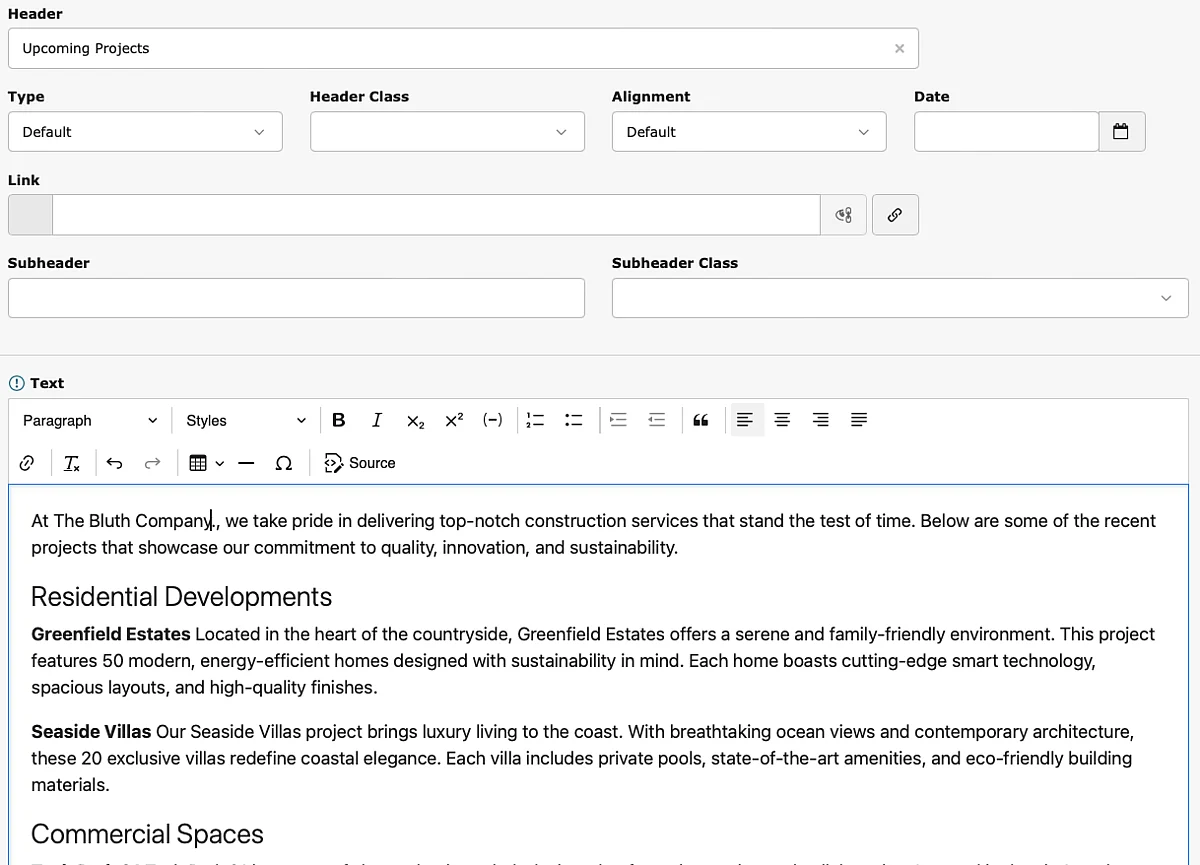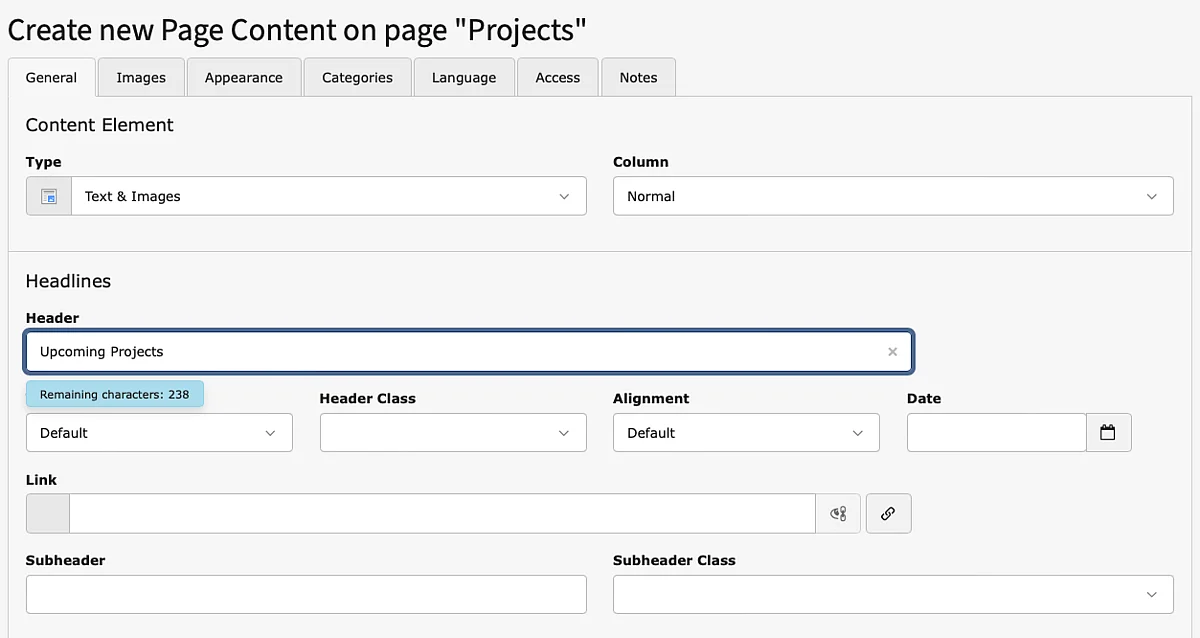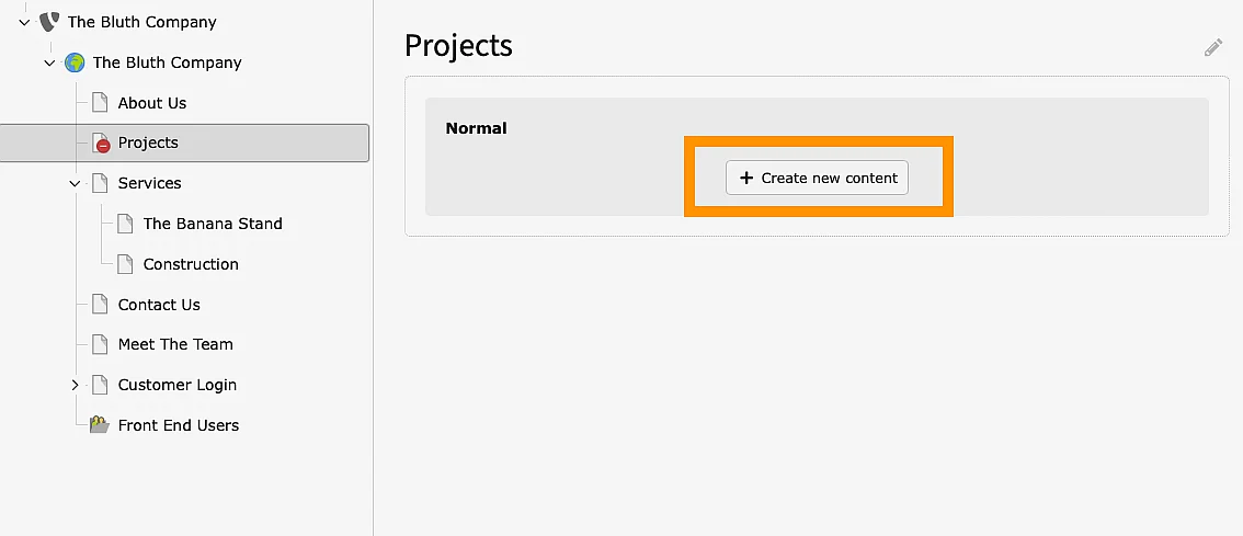 We now have a new Projects page with a single "Text & Images" content element on it. Once we are happy with our work: