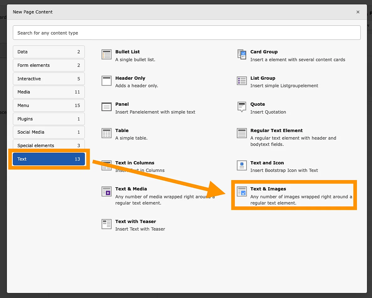 To do this, select the "Text" tab on the left hand side and then select the "Text & Images" content element.