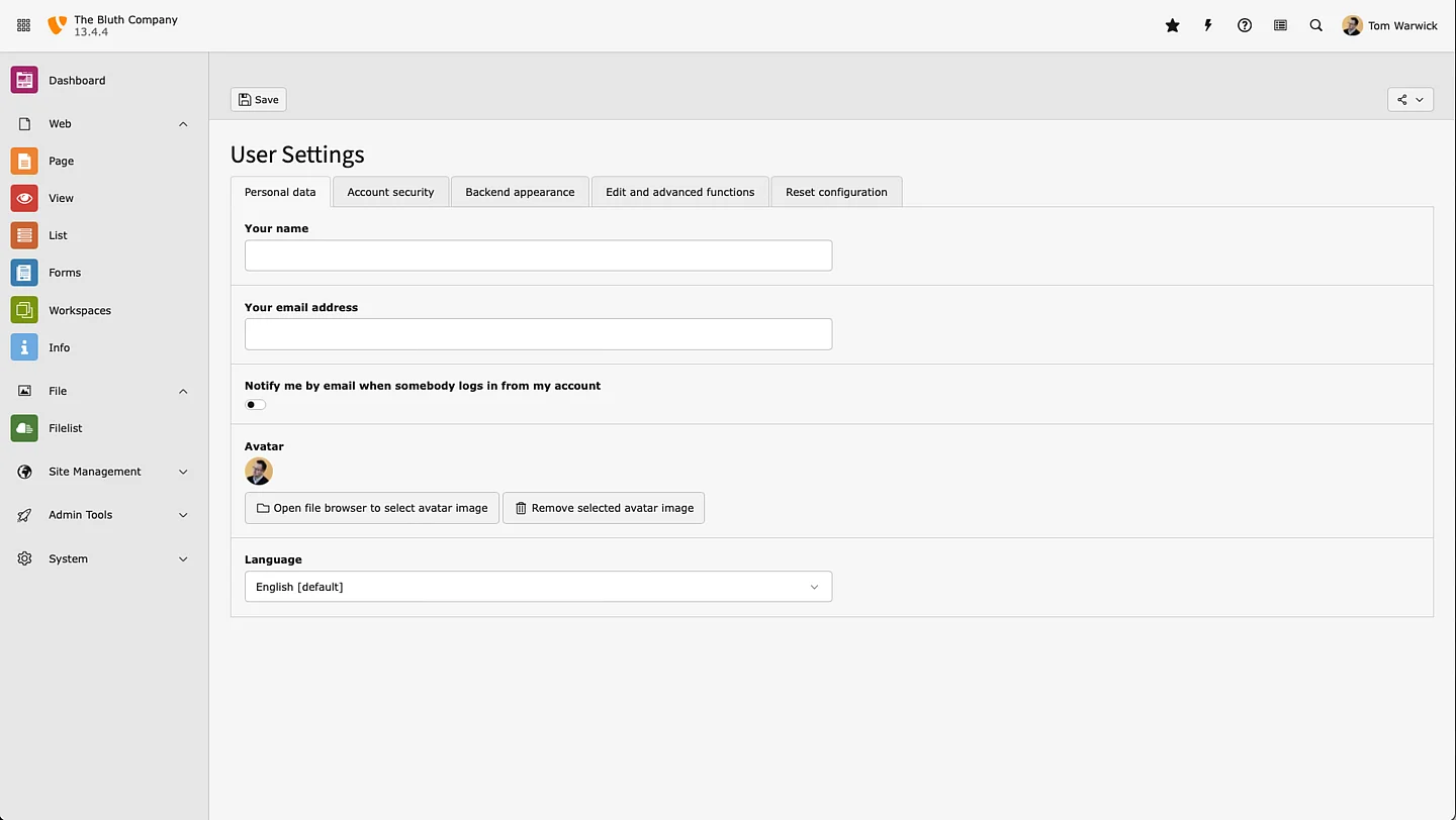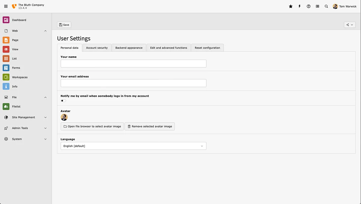 I can also change the language of the backend from my user profile. My installation includes additional languages, allowing me to easily switch and work in the backend in a different language if needed.