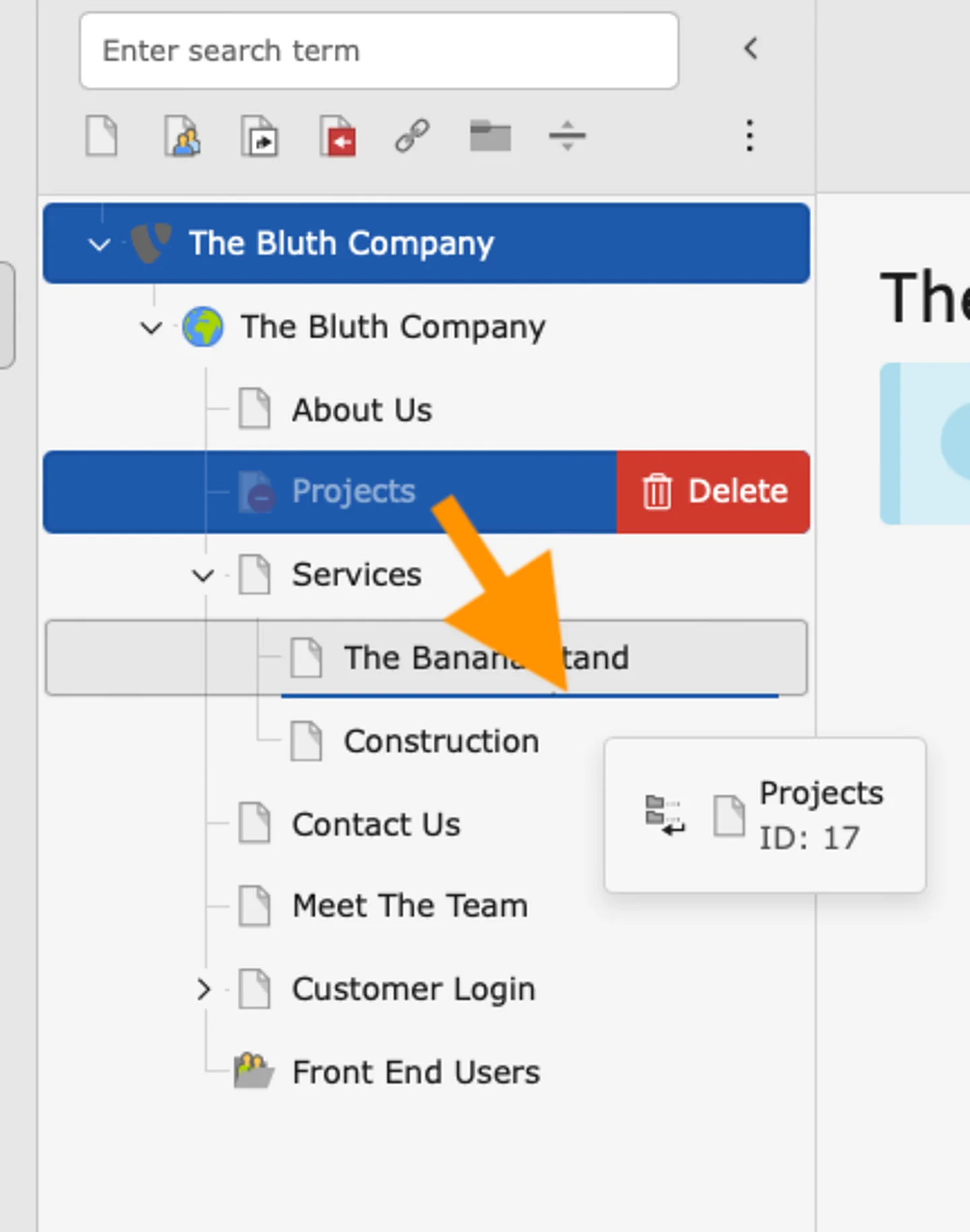If we want to move a page and place it somewhere else in the Page Tree. We drag the icon for our page and place it somewhere else in the Page Tree.