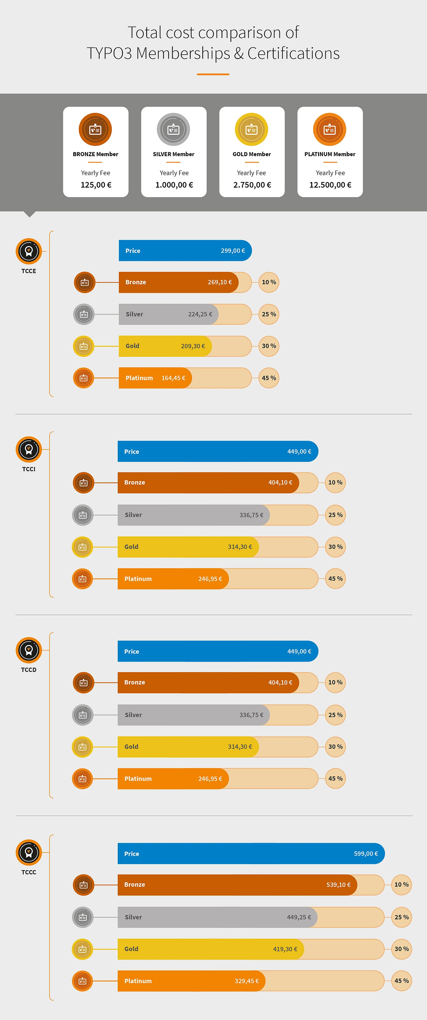 We are pleased to announce a new pricing structure for TYPO3 certifications, which will take effect as of July 1, 2024. This update includes a modest increase in certification prices and revised membership discounts, with significant enhancements for the Silver tier membership. This change correlates to our approach with the ELTS pricing announcement.