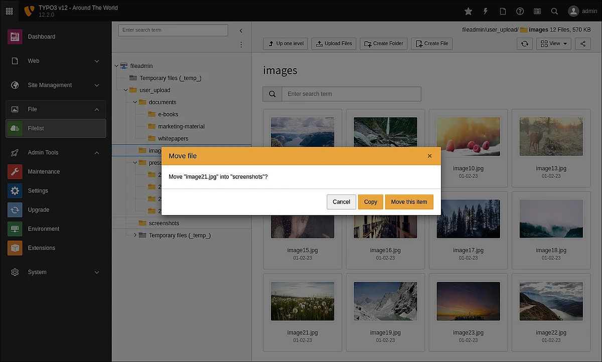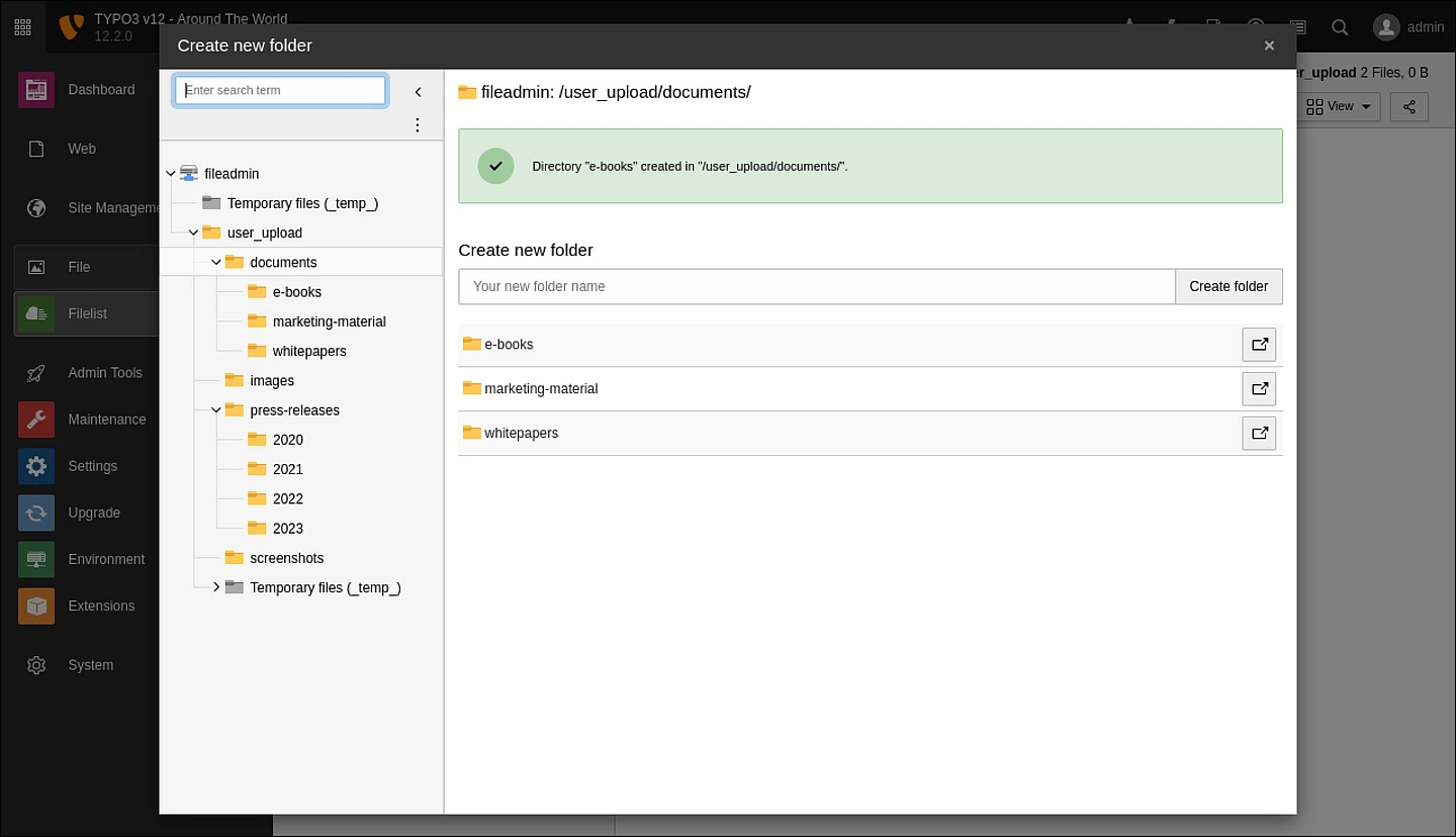 Say goodbye to the old way of creating folders! Instead of opening a new page, the module now opens a modal window where you enter the name of the new folder. You can also browse through the folder tree on the left-hand side to easily and quickly select a different parent folder.